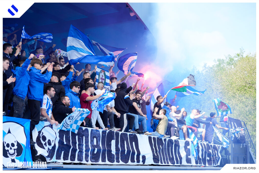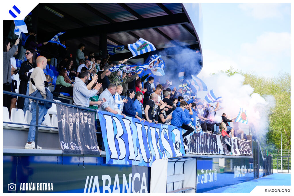 La convocatoria, impulsada por Riazor Blues, llenó la grada cubierta de Abegondo. La pancarta de Old Faces volvió a desplegarse, al lado de la de Blues, ambas acompañadas de una tercera tela con el mensaje que el grupo de animación dejó claro esta misma semana: «Ambición, unión e ilusión». Banderas blanquiazules ondeando en cada fila, bengalas, aplauso y el futuro de la hinchada, muchos niños viviendo en primera fila algo que jamás olvidarán.
