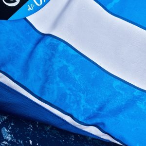 Como explican en el comunicado, esta nueva equipación cuenta con «dos rayas verticales azules en el frontal y una blanca del mismo ancho, junto con el ajuste de otras dos blancas a ambos lados, componen una parte delantera de la camiseta en la que el escudo, de goma en la parte izquierda, y el ommini de Kappa, en blanco en la parte derecha, ocupan esa posición elevada distintiva de todas las prendas de la marca italiana».