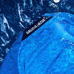 Destaca también su espalda, donde habrá un espacio para nombre y dorsal, que cambia «su masa plana azul Dépor por los tonos de los reflejos del agua del mar. En la parte posterior del cuello figura el nombre de la camiseta GALICIA AZUL escrito con la tipografía Abisinia, creada y especialmente adaptada para el Dépor por el diseñador gallego Rubén Prol«.