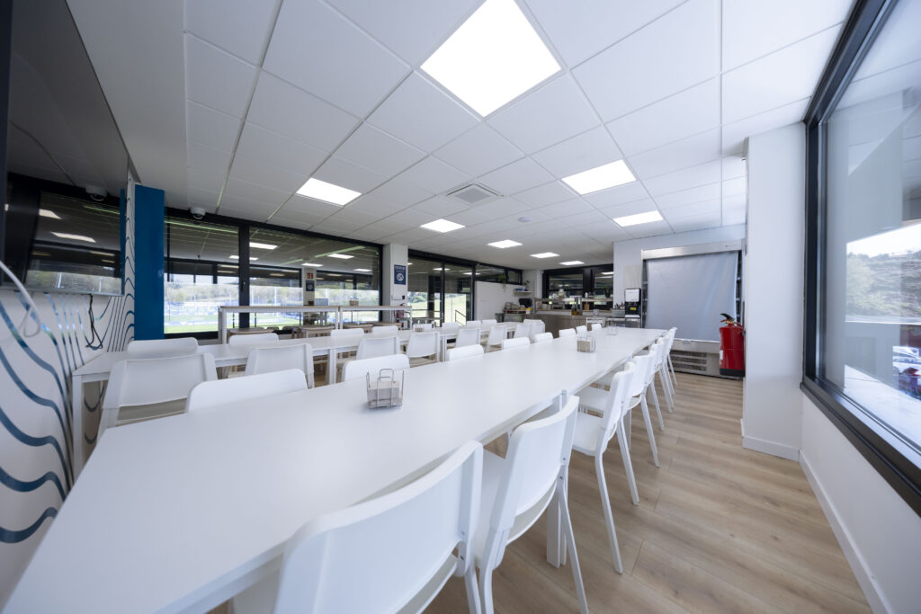 En el comedor y en otros espacios de convivencia, los mensajes cambian de registro. Allí, lo importante es el equipo. Por eso destacan los carteles que prohíben el uso del móvil, pensados para favorecer la comunicación y la unión de grupo más allá del terreno de juego.
