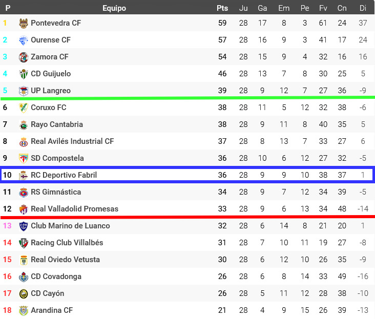 Lo que no puede negársele a este formato es que mantiene la emoción hasta el final. Quedan ahora mismo seis jornadas para el final de la temporada regular y prácticamente todos los equipos tienen algo por lo que pelear… y que evitar. El Fabril recibirá al Langreo, al Guijuelo y al Pontevedra en Abegondo, mientras que visitará al Cayón, al Coruxo y al Oviedo Vetusta.