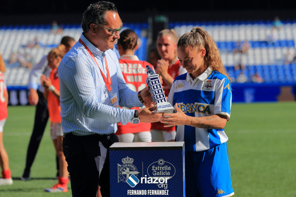 El final del encuentro dejó la imagen de la celebración sobre el césped cuando la alcaldesa Inés Rey hizo entrega de la Torre de Hércules a las futbolistas del Deportivo. Raquel García, Henar Muiña y Paula Gutiérrez fueron las encargadas de recoger el trofeo antes de celebrar con sus compañeras la sexta victoria deportivista en el torneo.