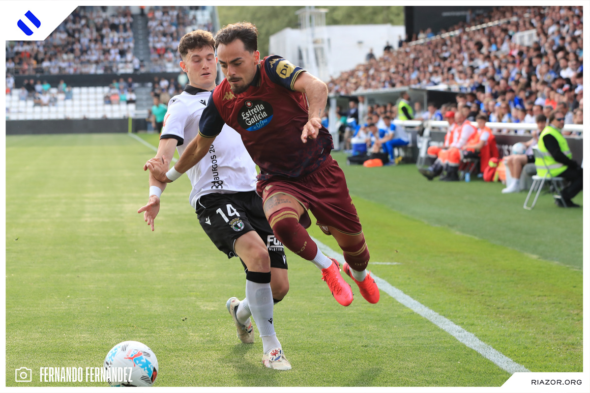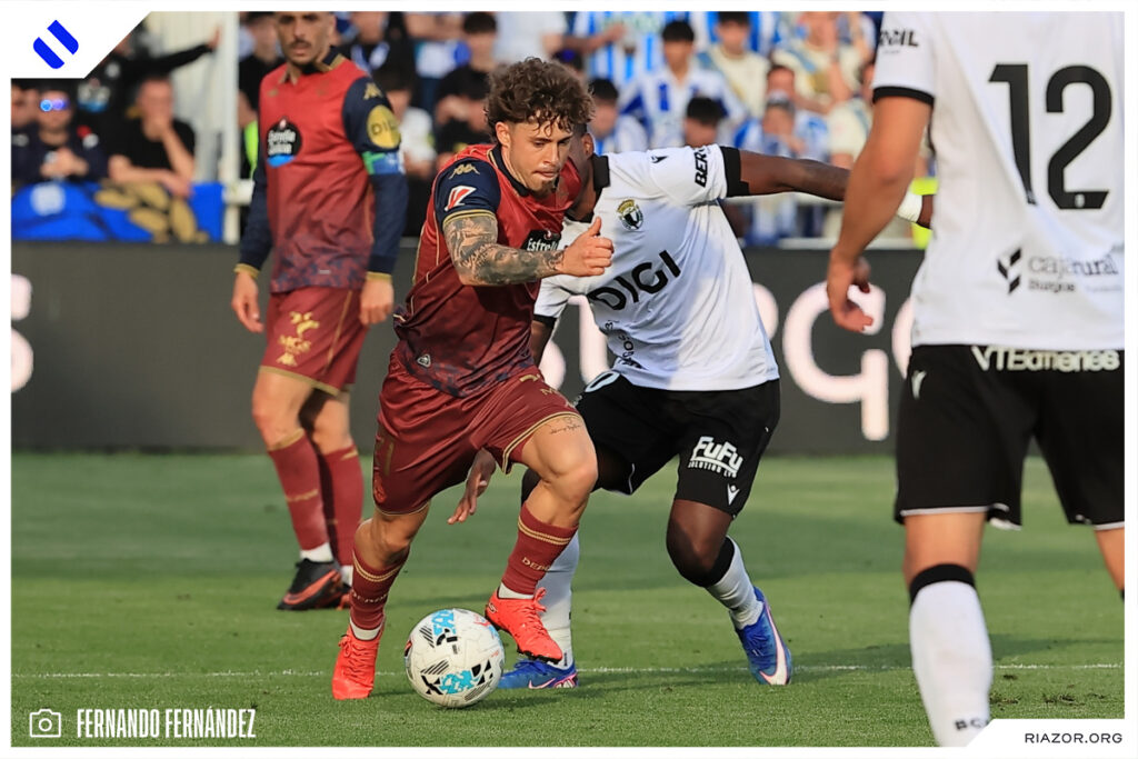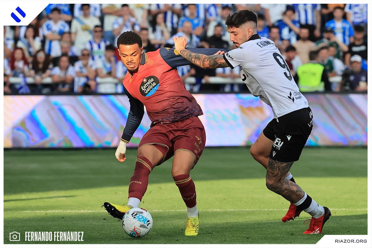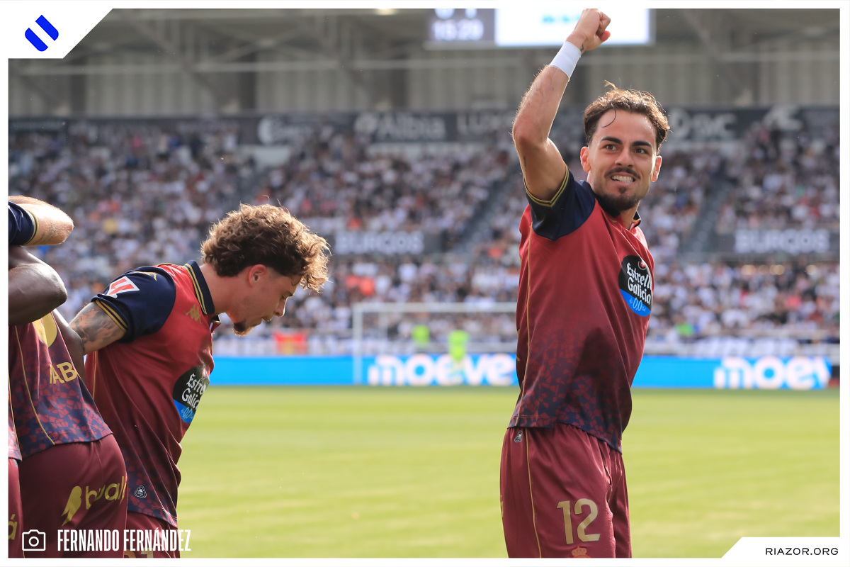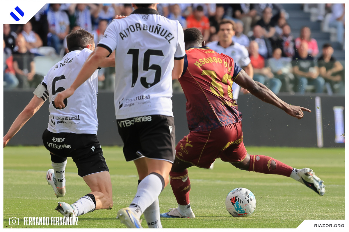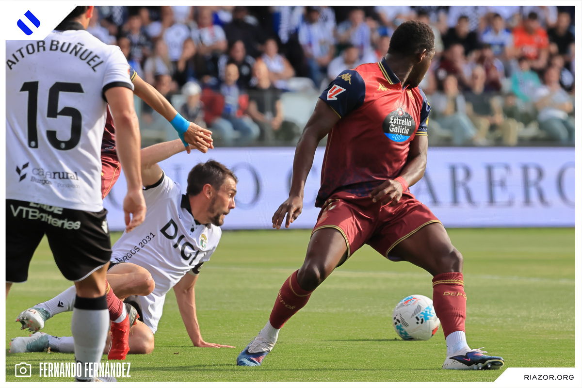 Tras un inicio igualado y de alta intensidad, el Deportivo pudo adelantarse en el electrónico pasado el cuarto de hora. Quagliata ganó línea de fondo y puso un peligroso pase atrás que llegó a puntear Luismi Cruz. El más rápido para recoger la pelota suelta fue un Nsongo Bil que perforó las redes burgalesas con un potente disparo raso.