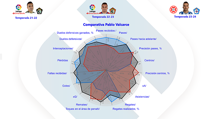 Pero toda esta sensación de futbolista apagado, incómodo e incapaz de generar ventajas es mucho más que una sensación. Porque los datos así lo demuestran. Sí, Pablo Valcarce recibe más balones que en sus dos últimas temporadas en el Burgos. Pero es algo lógico teniendo en cuenta el cambio de ecosistema. Ha pasado de ser cabeza de ratón en un Burgos reactivo a, teóricamente, cabeza de león en un Dépor que propone. Sin embargo, por el camino, ha perdido toda su fiereza, como apunta su promedio de 13,7 pérdidas por encuentro. Demasiado lastre para el colectivo y para que él mismo pueda remontar.