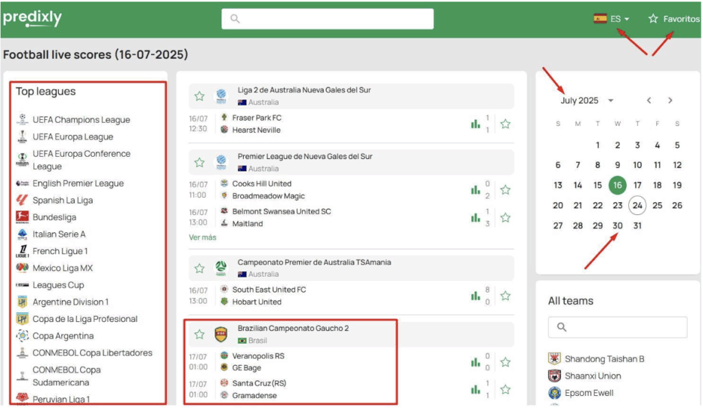 La facilidad de uso y las numerosas funciones únicas permiten explorar las estadísticas de fútbol de forma sencilla con Predixly.com en vivo. Añade tus partidos, jugadores o equipos favoritos a tu perfil y recibe actualizaciones en tiempo real. Viaja al pasado para revivir partidos históricos o adelántate a los próximos enfrentamientos con el calendario interactivo. Predixly no solo te convierte en un aficionado, sino en un analista profesional de fútbol.