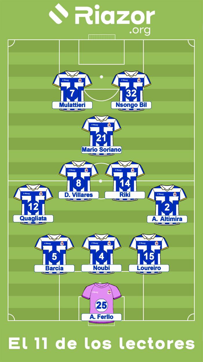Nuestros lectores parecen dejar en un segundo plano la dureza de un calendario con tres jornadas ligueras en una misma semana a estas alturas de la temporada y optan por incidir a grandes rasgos en la propuesta del último choque frente al Córdoba. Así las cosas, Álvaro Ferllo (83% de los votos) se mantendría bajo palos. La defensa tampoco sufriría alteraciones con Adriá Altimira (91% de los votos) y Quagliata (97% de los votos) ejerciendo de carrileros y con un eje de la zaga formado por Miguel Loureiro (78% de los votos), Dani Barcia (57% de los votos) y Lucas Noubi (97% de los votos).