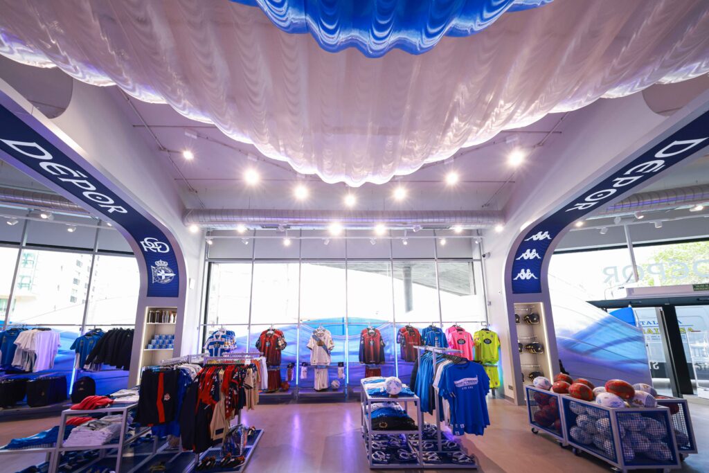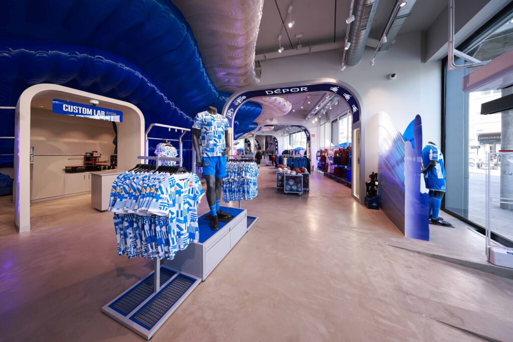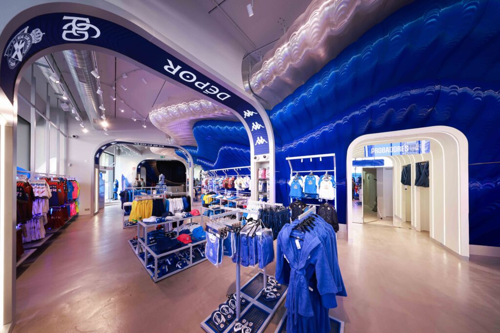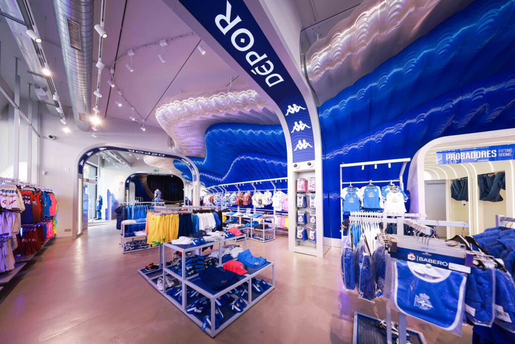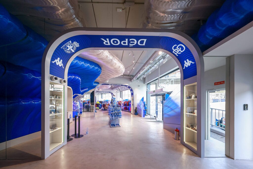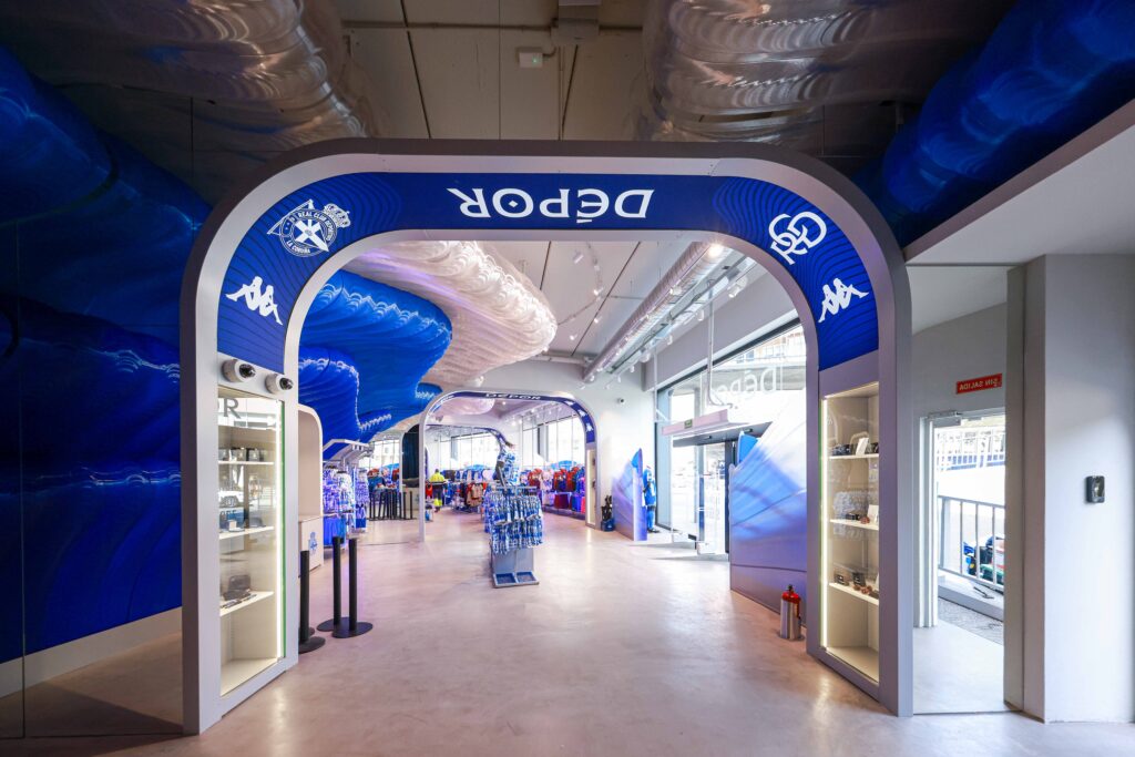 El proyecto, desarrollado por Noumena Group, ha transformado por completo el espacio comercial del estadio herculino. El nuevo diseño, obra del estudio External Reference y liderado por LAMÁQUINA, incorpora una narrativa visual vinculada a la identidad del club y su relación con el Atlántico. El elemento central de la tienda es una gran estructura en forma de ola, concebida como representación de la marea blanquiazul, fabricada con plásticos reciclados (PETG) mediante impresión 3D robótica.