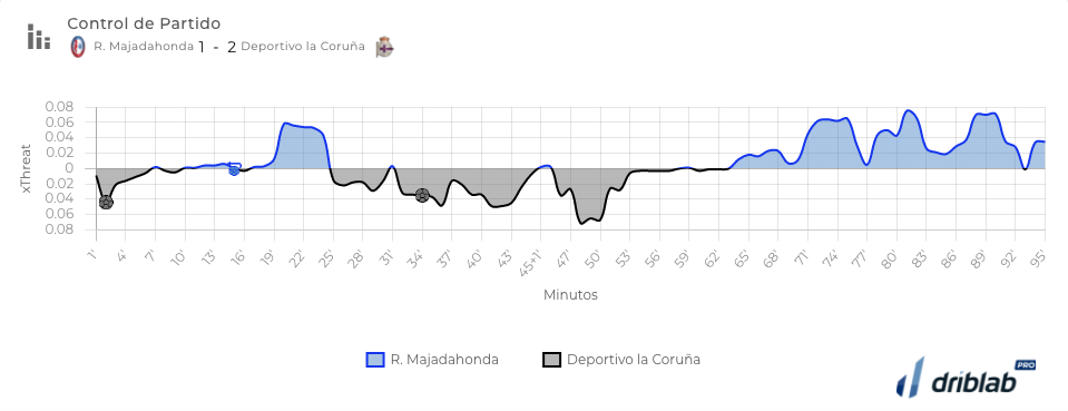 En la gráfica de control de partido se observa cuánto peligro y quién domina en cada minuto de partido. El Deportivo empezó dominando y marcando, pero el Rayo Majadahonda le dio la vuelta al control y tuvo varios minutos desde que empató. Los de Borja Jiménez se rehicieron y hasta el minuto 65′ dominaron, cuando posteriormente el equipo se replegó ante un Rayo que tuvo la posesión pero sin apenas inquietar a Ian Mackay.