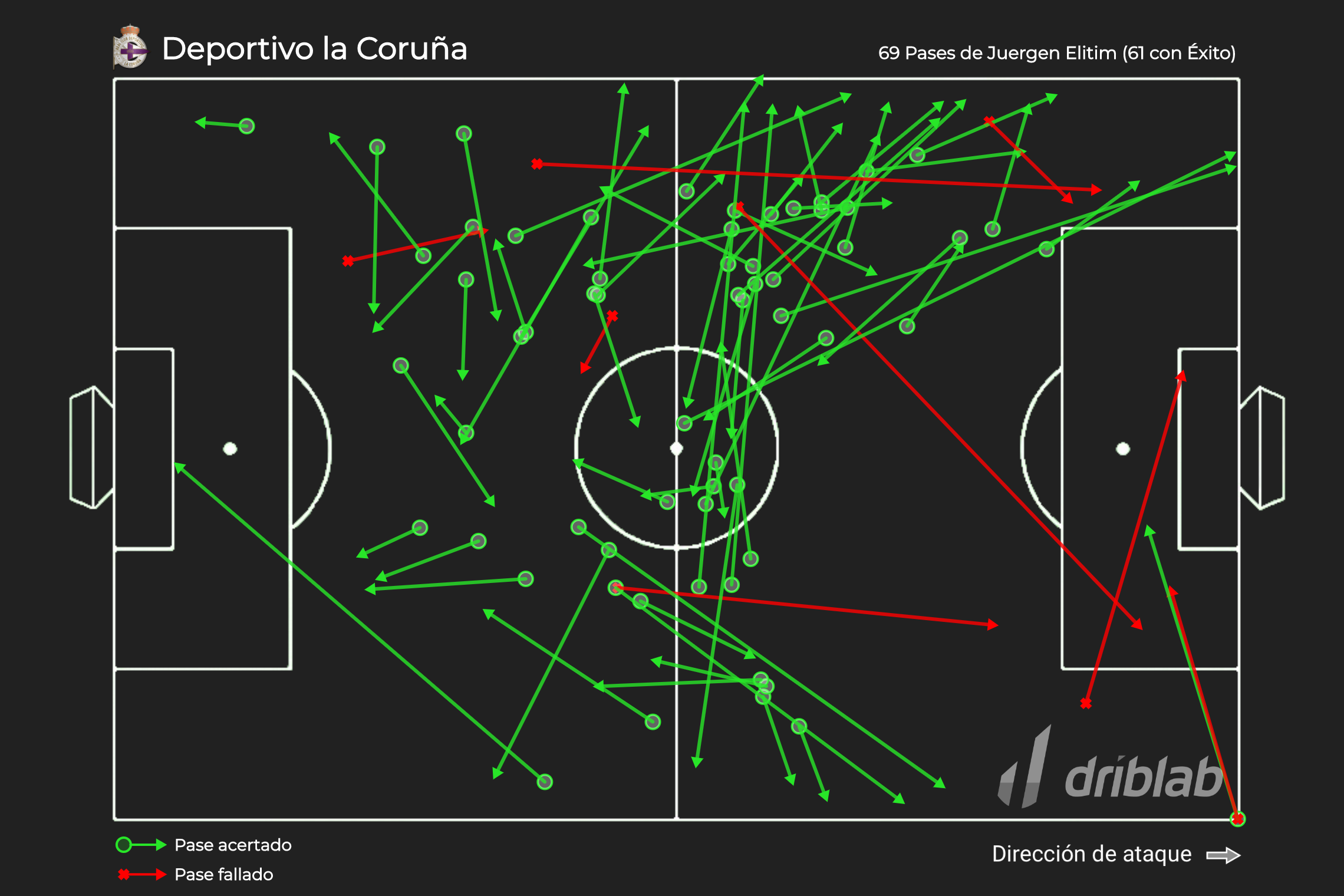 Además, cabe destacar el porcentaje de pases acertados de Juergen Elitim. Durante los 90 minutos, distribuyó un total de 61 pases con éxito de los 69 en total. En la imagen se observa en verde las entregas con éxito y en rojo los fallados.