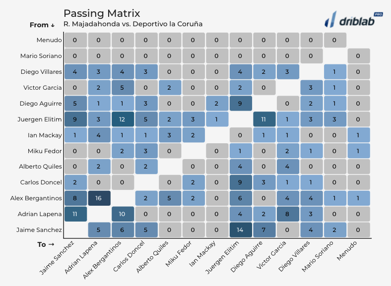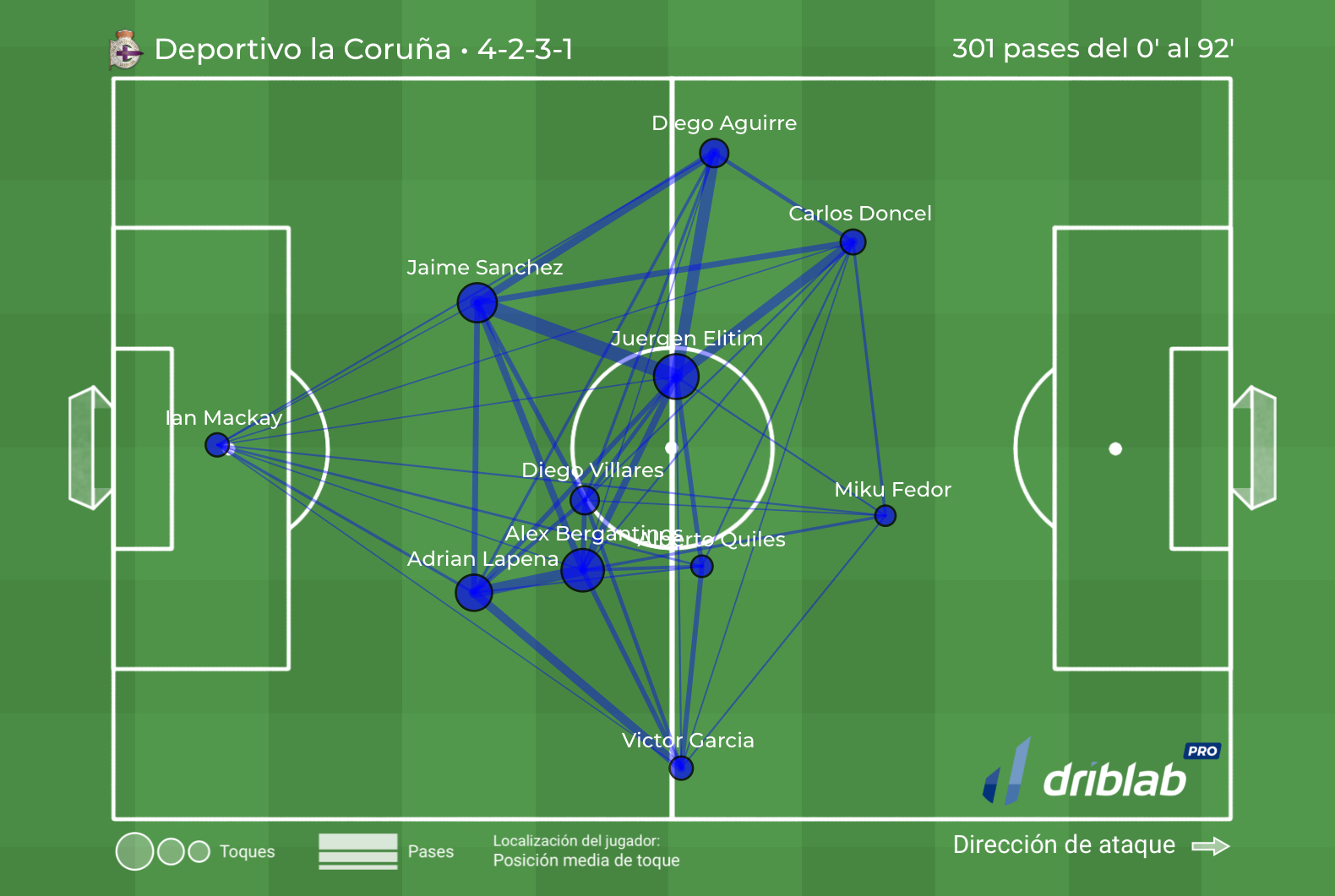 El centrocampista colombiano se encargó de repartir juego en el Deportivo. Como se observa en el siguiente diagrama, dominó el centro del campo estableciendo líneas de pase tanto con Jaime, como en las bandas hacia Diego Aguirre y Carlos Doncel. También enlazó con Diego Villares y Quiles. El grosor de la línea indica las veces que conectó con otro compañero.