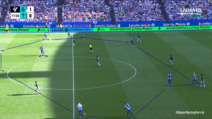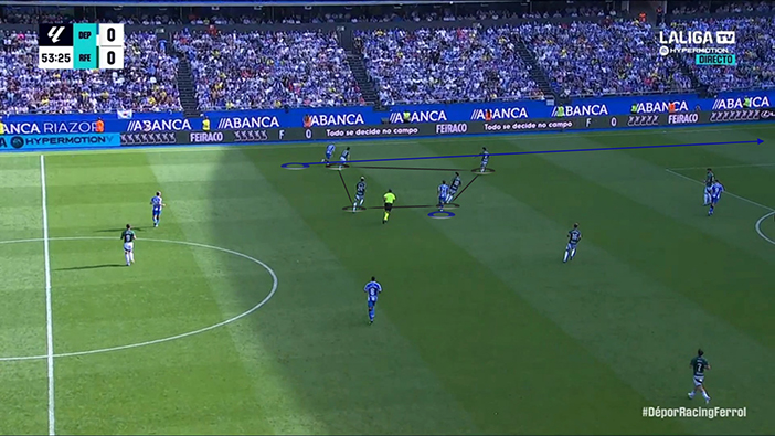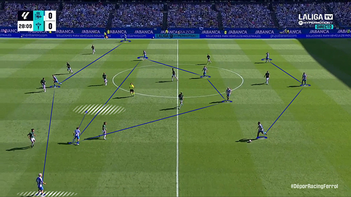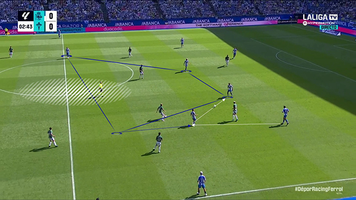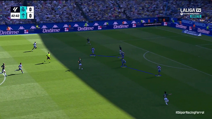 Así, con su plan, Idiakez buscaba generar un cuadrado en el centro del campo con el que obtener superioridad contra los dos mediocentros de un Racing de Ferrol que, como se esperaba, se estructuró a nivel defensivo en 4-4-2 y se situó en un bloque medio-alto. Con esta predisposición, el rival tenía dos soluciones: o conceder pases interiores o priorizar cerrar esos pasillos a costa de hacerse más estrecho. Como es lógico, el Racing eligió la segunda opción, pues siempre es preferible conceder los espacios más alejados de tu propia portería. Ahí entraba la alternativa local: encontrar en situación de ventaja a Mella y a Yeremay. Un escenario idílico, pero que apenas se dio.