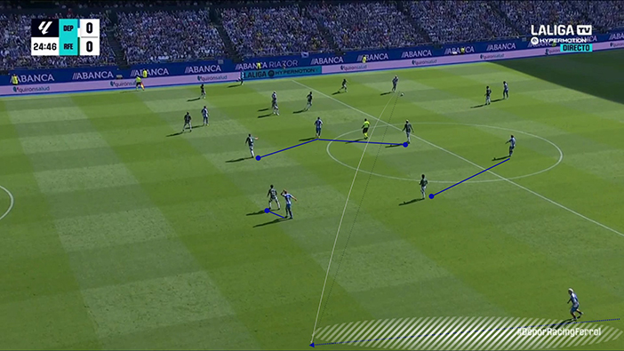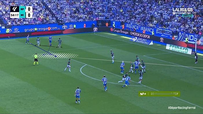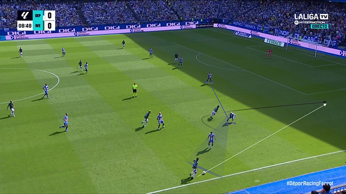 Todo fue muy corto y horizontal, a través de asociaciones cercanas y poco dañinas, o excesivamente largo. Porque sí, cuando el Dépor no encontraba el camino, acababa buscando o bien a Barbero para la disputa aérea o la pelea al espacio, o bien a Mella y Yeremay. Pero lo hacía con cambios de orientación demasiado evidentes, sin mover previamente al bloque rival y, por tanto, fácilmente defendibles a pesar de los intentos de aclarado del Dépor.