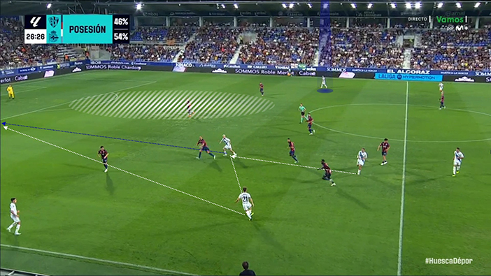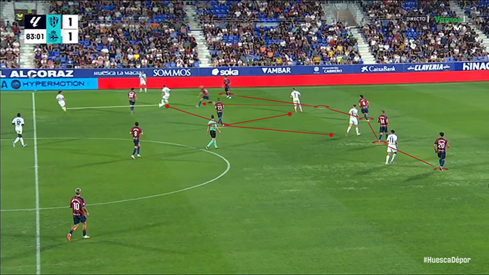 Ese movimiento provocado por la doble punta deportivista generó más espacio por dentro. Donde estaba Sielva, ya no había nadie. Faltaba un Mario Soriano que había bajado definitivamente a la base. Pero ahí, para dañar una y otra vez apareció Yeremay Hernández. Con el ’21’ distribuyendo desde atrás, el ’10’ ejerció el papel del Joker y desató el caos en el choque. El Deportivo empezó a encontrar fluidez y ritmo por dentro para girar al Huesca y acabar amenazándole por fuera. La ocupación de espacios era tan racional que, además, el equipo lograba recuperar tras pérdida e impedía salir una y otra vez a su rival. Y así, llegó el gol(azo) de Ximo.