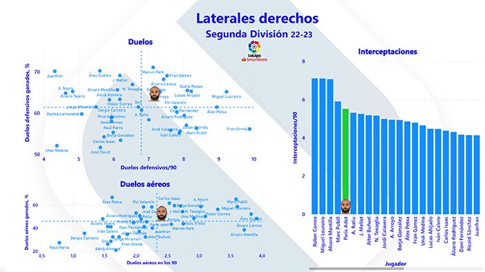 Precisamente esas cualidades en las disputas le permitieron ser el quinto lateral derecho con más intercepciones (cortes de balón o recuperaciones) por cada 90 minutos de juego. Porque Paris Adot es un futbolista pegajoso en el aspecto defensivo, que tiene su mejor virtud en su capacidad para medir distancias con su marca cuando es posible receptor de balón. Ahí sabe cómo y cuándo acosar para impedir el giro, pues es muy agresivo y, a la vez, controla lo suficiente para no pasarse de ímpetu y quedarse fuera de la jugada por tratar de anticipar.