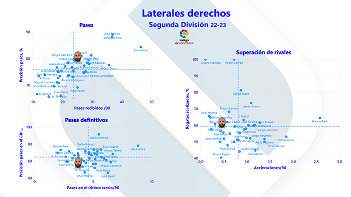 Esa buena capacidad en las disputas también la fue capaz de trasladar al juego aéreo. Su 172 centímetros le colocan como un lateral ‘bajito’, alejado del perfil más moderno de defensor de banda. Pero su altura no le limita a la hora de competir por alto, como demuestra el hecho de que se situase algo por encima de la media de los laterales derechos de la categoría (con más de 800 minutos) en cuanto a duelos aéreos ganados (el 47%, siempre según Wyscout).