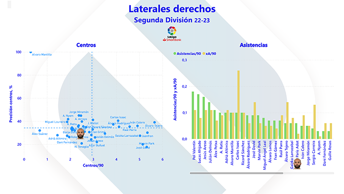 Al margen de promediar menos centros que la media en su posición, el lateral de la Ponfe fue uno de los futbolistas con menor precisión a la hora de encontrar a un compañero en este tipo de envíos. Eso le llevó a situarse entre los peores en cuanto a asistencias esperadas (las xA se calculan en función de la ‘calidad’ de los pases que acaban en remate, sean o no gol).