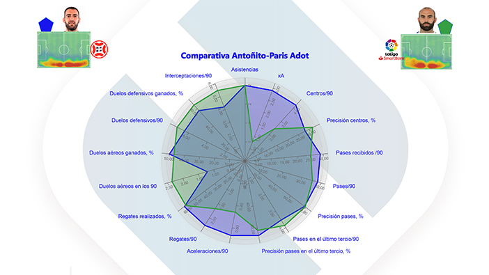 Es, en definitiva, un lateral parecido a Antoñito. El andaluz era difícil de superar en el uno para uno y Adot también. El exjugador del Deportivo aparecía incorporándose con buen timming y mucho fuelle y Adot también. Antoñito no era demasiado preciso en los centros y Adot, lo mismo. ¿La diferencia? Que Paris es todavía mejor a en algunos aspectos como a la hora de presionar hacia delante. Y además, viene de rendir en una categoría superior y, por lo tanto, se espera que un escalón más abajo eleve el techo del lateral derecho.