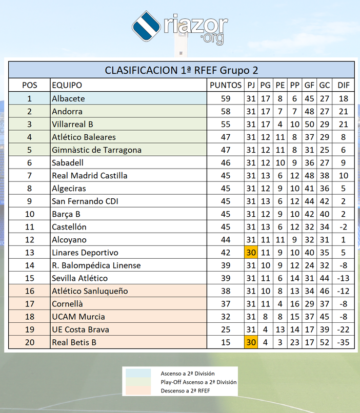 Clasificación de Los Otros tras la jornada 31 en Primera RFEF