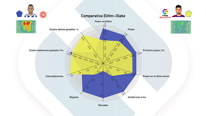 Así, Roberto Olabe se asemeja a Juergen en su lateralidad zurda. Algo que le hace tener querencia por jugar mucho más acostado a ese perfil. Y, por tanto, pisar coordenadas muy similares a las de Elitim en el Dépor. Esas semejanza en la pierna hábil se acrecienta todavía más en la ejecución de pase. Ambos tienen capacidad para jugar en corto, en envío medio y en largo. Por precisión y por visión. Y además, su talento para proteger la pelota les hace sobresalir. Aunque Elitim utilice en este sentido recursos mucho más plásticos.