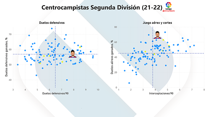 Si con balón Roberto Olabe presenta un perfil interesante y con semejanzas a Juergen, es en el momento sin balón donde el Deportivo recluta un valor ‘superior’. Porque pese a su poco más de 1,75, el vitoriano posee una buena carrocería que le hace no rehuir duelos. Olabe fue uno de los centrocampistas que más duelos defensivos promedió el pasado curso en Segunda. Y aunque su porcentaje de acciones ganadas estuvo algo por debajo de la media, sobresalió muchísimo en el juego aéreo. Pocos medios hubo mejores que Roberto en cuanto a las disputas por alto, pese a que su estatura podría indicar lo contrario.