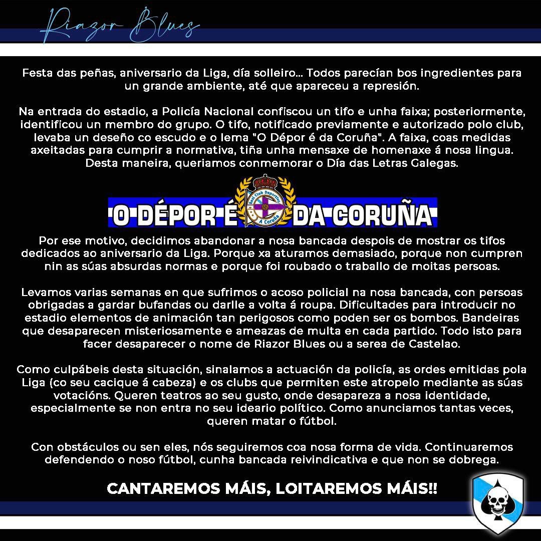 El propio grupo lo confirmó a través de un comunicado en sus redes sociales en el que se señala como culpables de esta situación a «la actuación de la policía, las órdenes emitidas por la Liga y los clubes que permiten este atropello mediante sus votaciones». El motivo de la discordia, en esta ocasión, fue la confisca de un tifo y una pancarta en homenaje al Día das Letras Galegas.